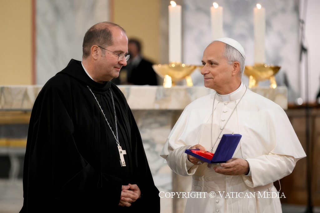 J’espère que vous pouvez sentir à quel point votre présence signifie pour nous, Bénédictins, aujourd’hui – ceux qui sont ici à Sant’Anselmo, mais aussi notre famille mondiale de moines et de moniales à travers le globe. Nous sommes très conscients que nous devons au Pape Léon XIII d’avoir cet endroit ici à Rome. Et nous sommes profondément joyeux de pouvoir remercier son successeur et homonyme aujourd’hui. De la plénitude du cœur la bouche veut parler, et beaucoup ! Le préfet de votre maison m’a cependant averti d’être bref, et je comprends parfaitement pourquoi. Je ne dirai donc que trois choses.